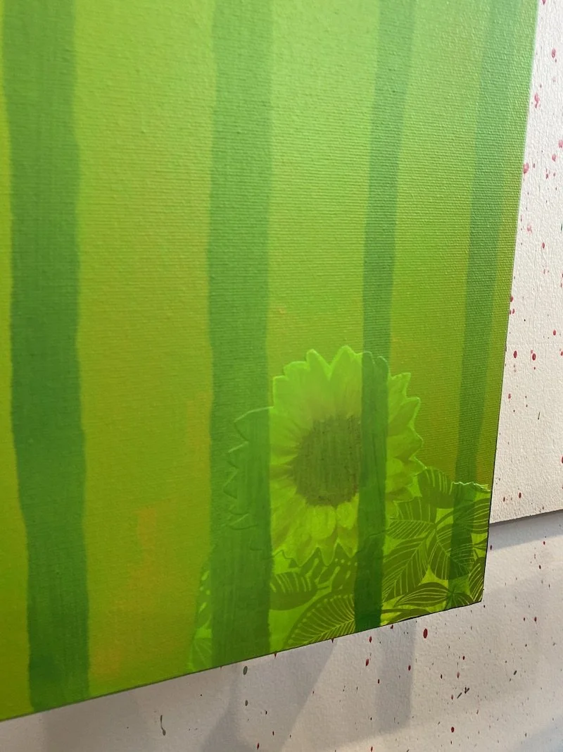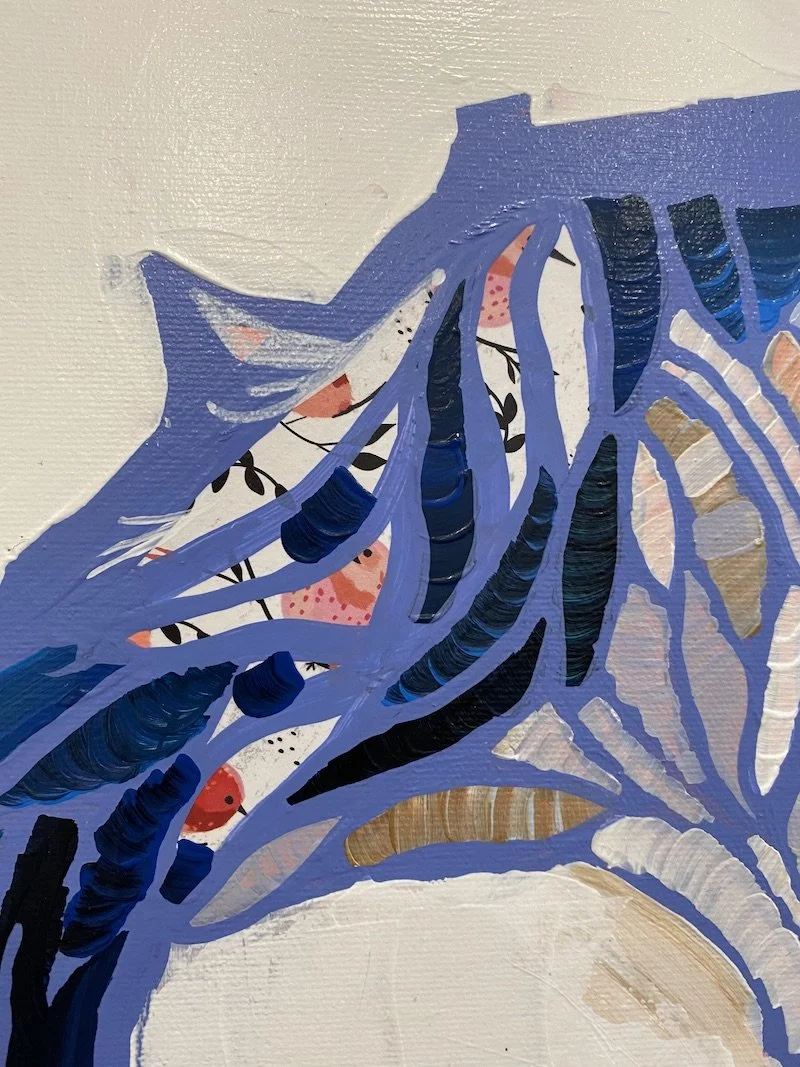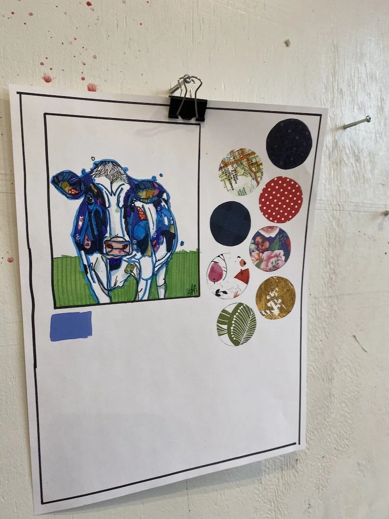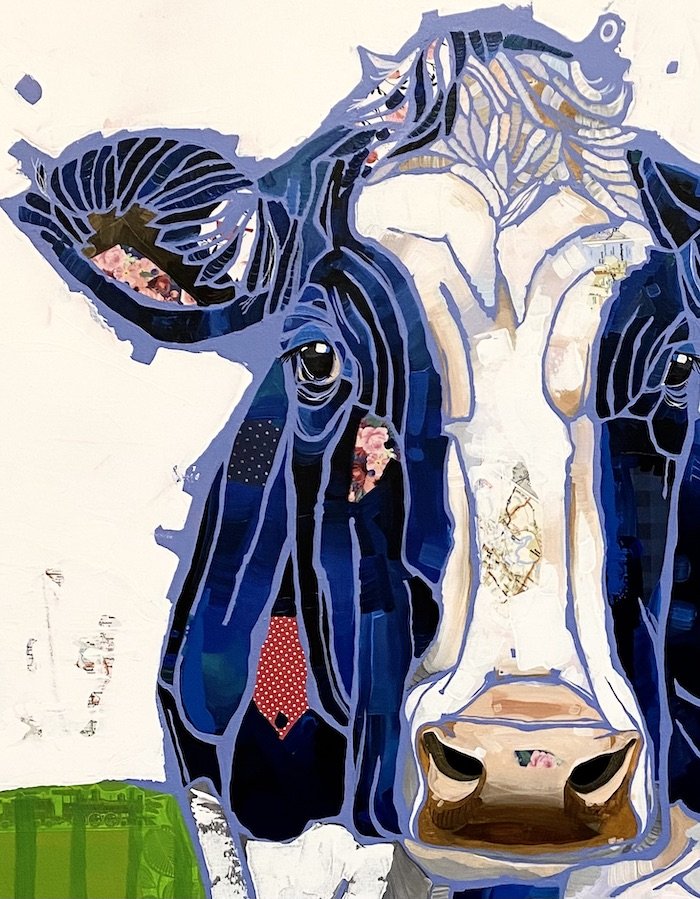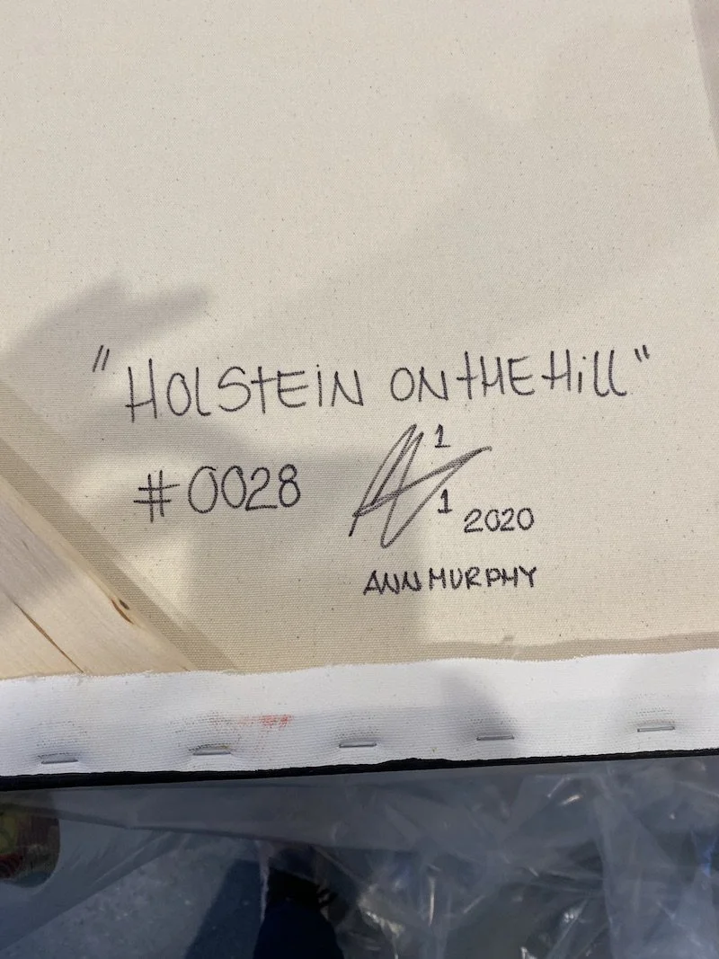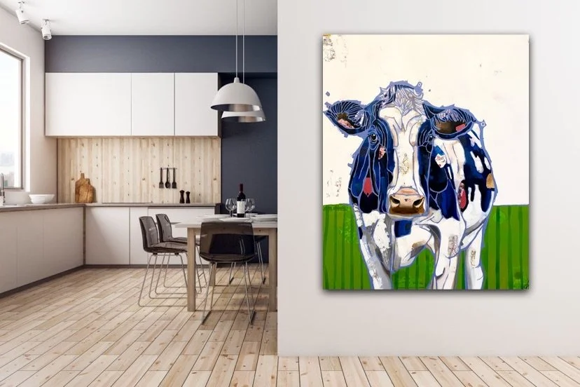 Holstein on the hill is a commission that was created during the pandemic.It was a perfect collaboration between artist, gallery and client. the process began with a sketch and client approval. With this piece the clients had a fun idea of wanting to incorporate symbolism that would represent each family member so after a bit of discussion we came up with an idea of papers that would be subtly sprinkled throughout the piece. This cow turned out beautifully the colour scheme is soft and the monochromatic background offers a contemporary vibe .Commissions turn out best when you have a client who loves your style and is willing to let you loose with your ideas.